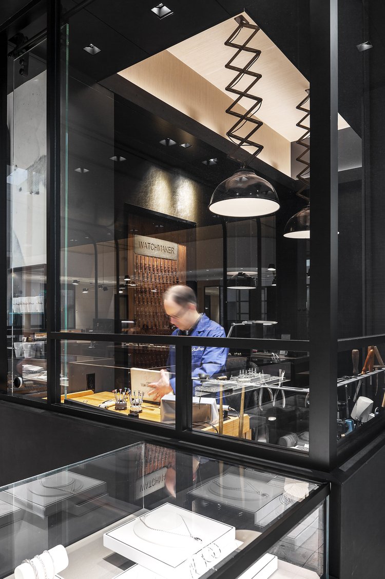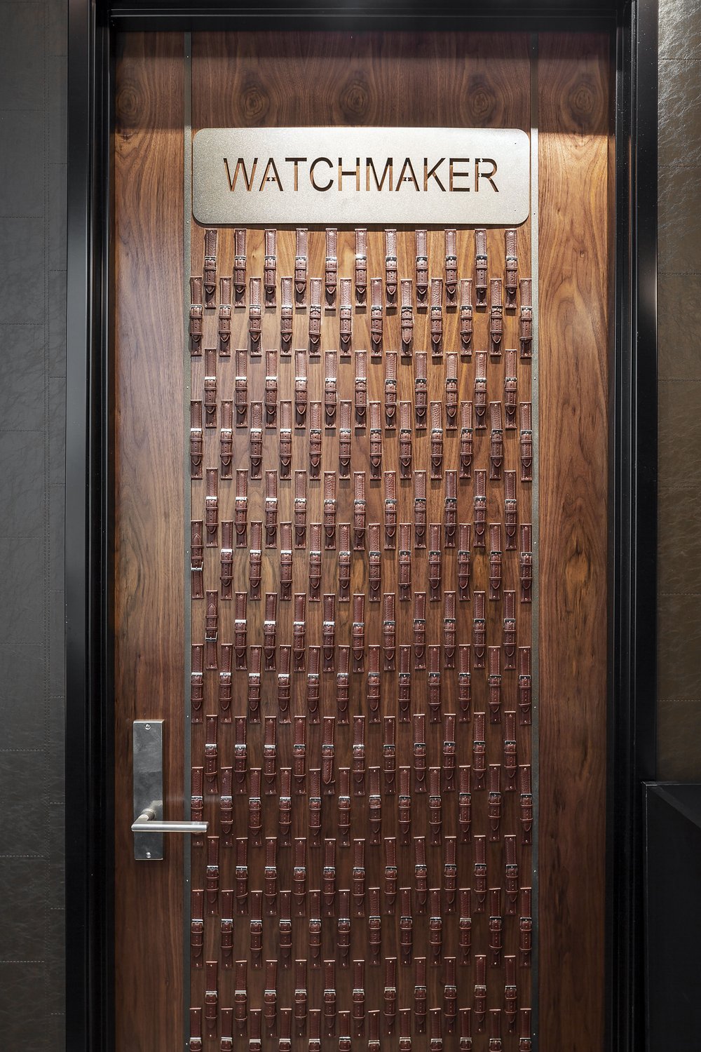 Working with SKB Architects and our internal Visual Merchandising department (which I was a part of) we envisioned a space that would tell the real brand story that Ben Bridge Jewelers had to offer. Billed as the new storefront model for all future stores and remodels Ben Bridge intended to infuse the space with interactivity. My part in this buildout was twofold; help inform the visual merchandising planning and our ability to bring elevated design and signage into the space. What transpired thanks to many meetings and brainstorming sessions with SKB was the concept I imagined for the watchmakers space paying homage to the texture of watch band leather and “wrapping” the door in actual band leather.